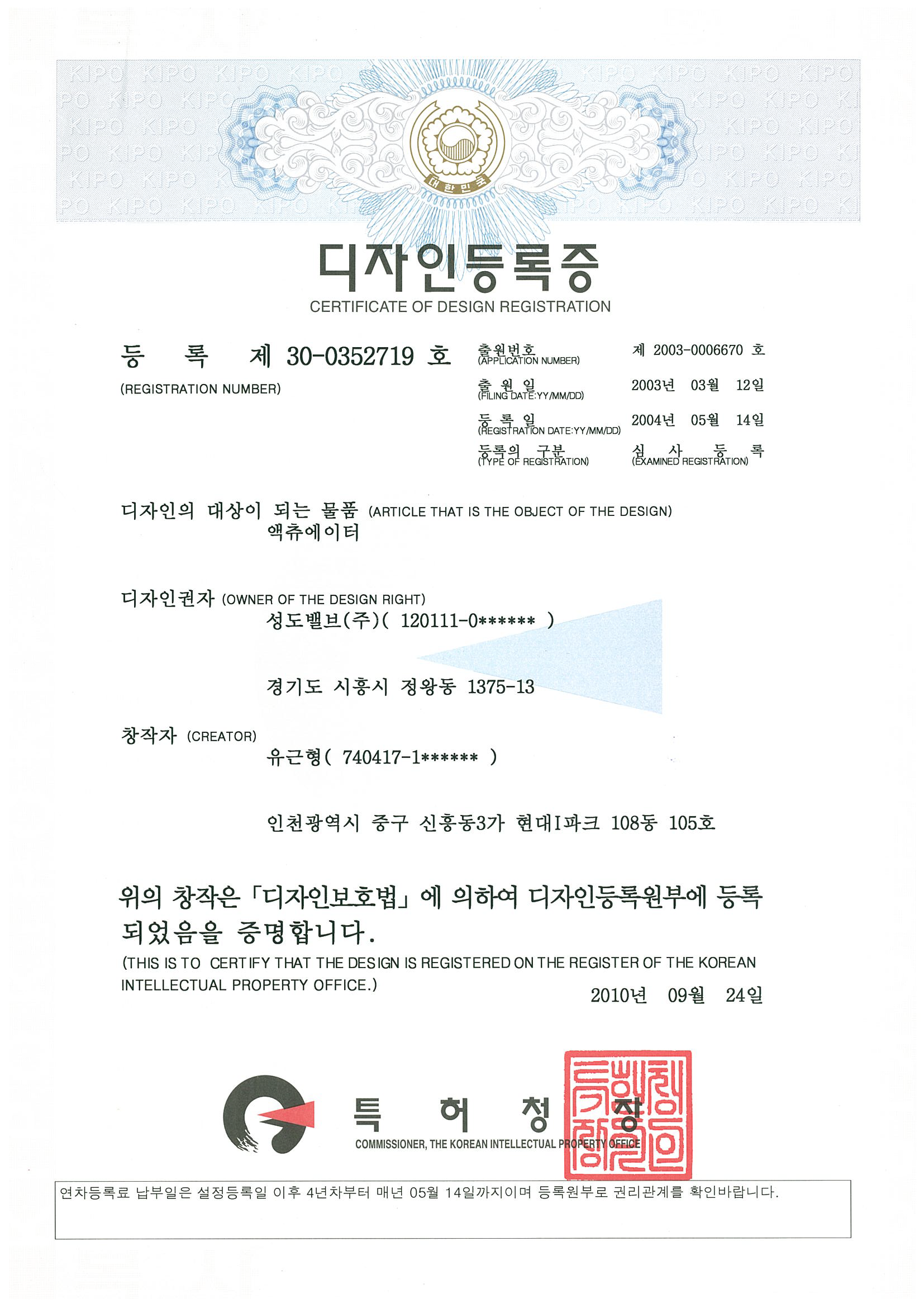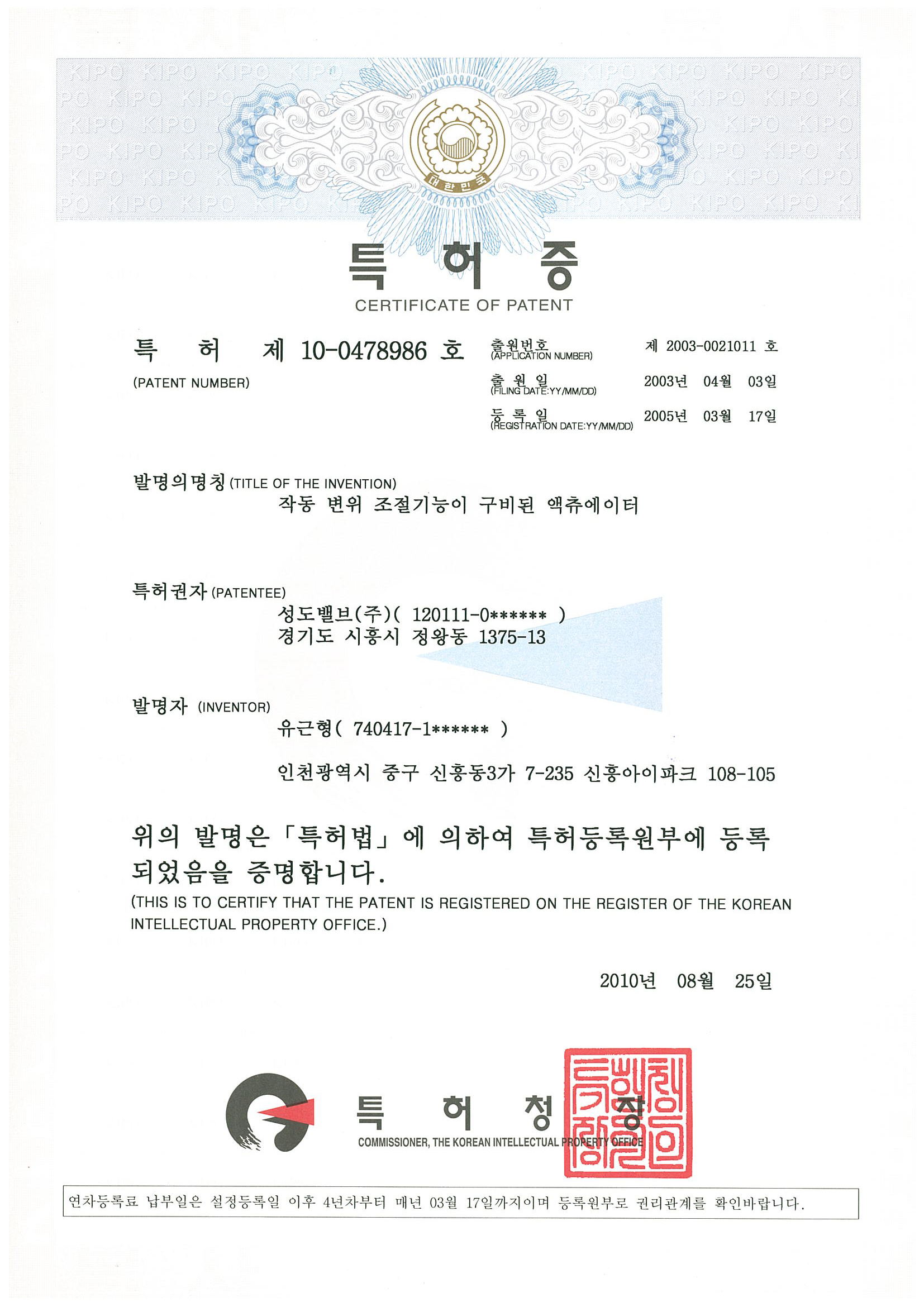 특허증(작동 변위 조절기능이 구비된 액츄에이터)
