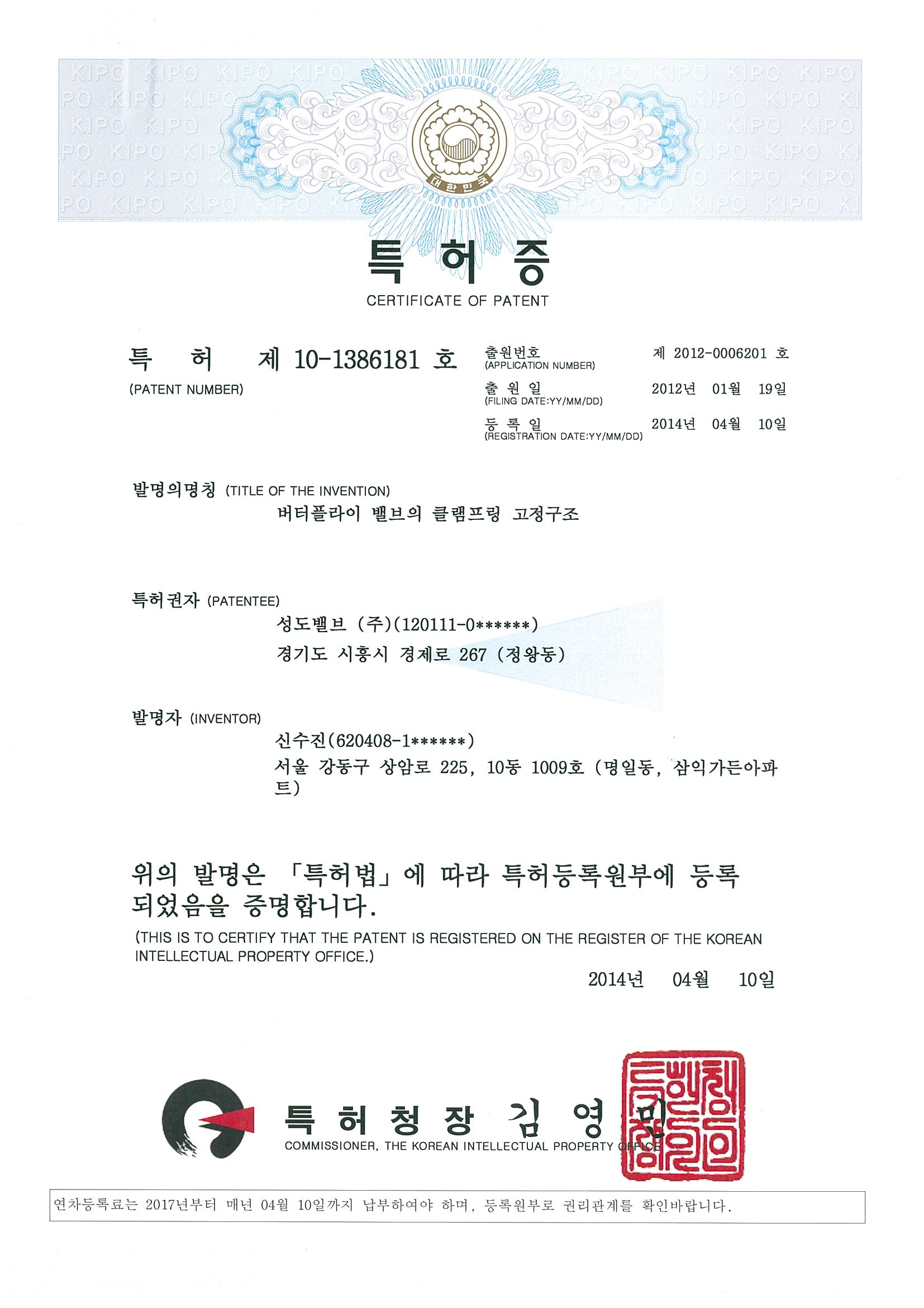 특허증(버터플라이 밸브의 클램프링 고정구조)