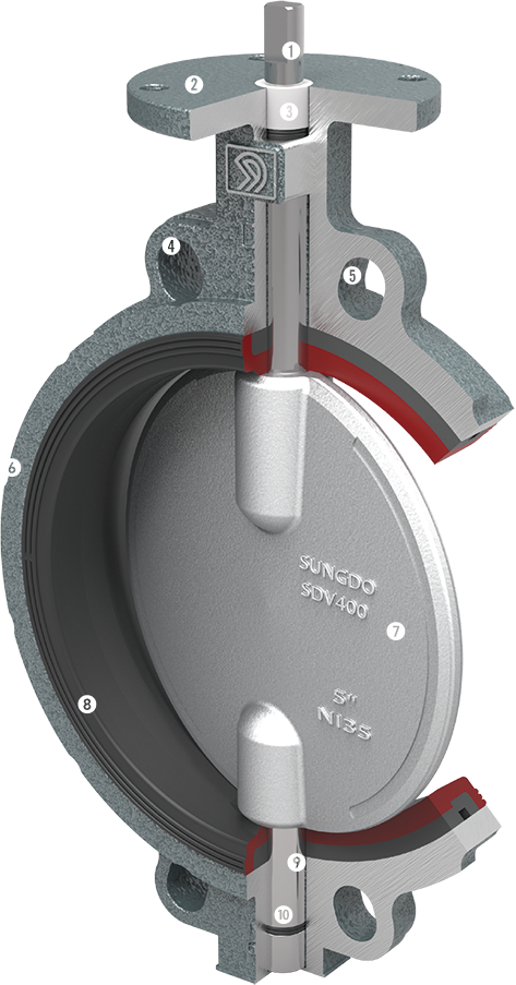 Moulded flats in the resilient seat (where stem passes through) compress against the Matching flats on the disc that provide the primary stem seal, eliminating leakage into the stem area.